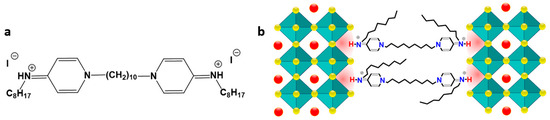 Molecular structure of octenidine dihydroiodide (a) and a schematic illustration of the Dion–Jacobson phase that could be formed as a result of OctI2 integration into crystal lattice (b).