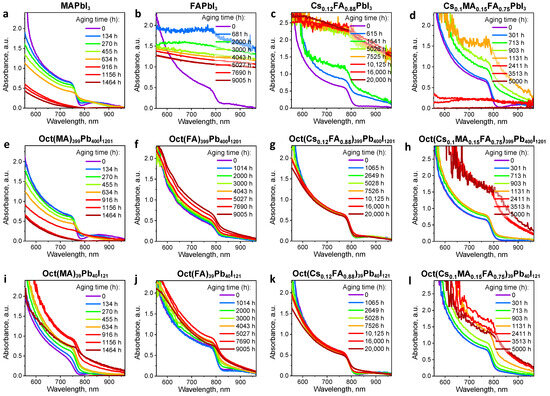 Evolution of the UV–Vis spectra of the Oct(A)n−1PbnI3n+1 films depending on the OctI2 loading as compared to the reference APbI3 samples, where A = MA (a,e,i), FA (b,f,j), Cs0.12FA0.88 (c,g,k), and Cs0.1MA0.15FA0.75 (d,h,l) as a function of the aging time.