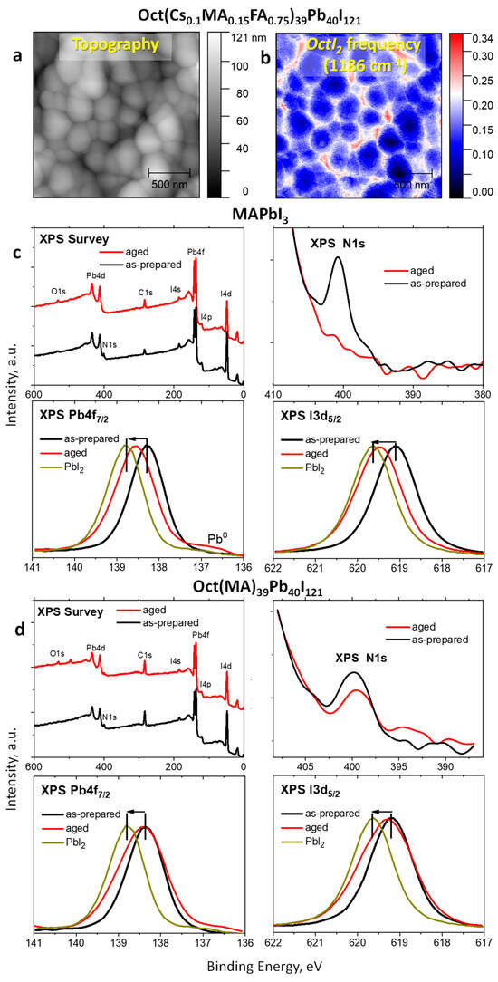AFM topography (a) and s-SNOM amplitude images for the Oct(Cs0.1MA0.15FA0.75)39Pb40I121 film recorded at the characteristic frequency of OctI2 (b). XPS survey, N 1s, Pb 4f7/2 and I 3d5/2 spectra of glass/MAPbI3 (c) and glass/Oct(MA)39Pb40I121 (d) films before (as prepared) and after exposure to light for 1464 h (aged).