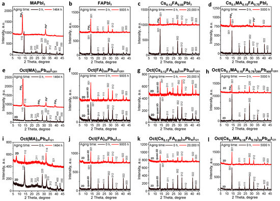The XRD patterns shown in Figure 4 reveal that the phase composition of the aged films is completely preserved and no signs of decomposition products appear after light exposure for 9000 h in the case of Oct(FA)n−1PbnI3n+1 (Figure 4f,j) and 20,000 h for Oct(Cs0.12FA0.88)n−1PbnI3n+1 (Figure 4g,k).