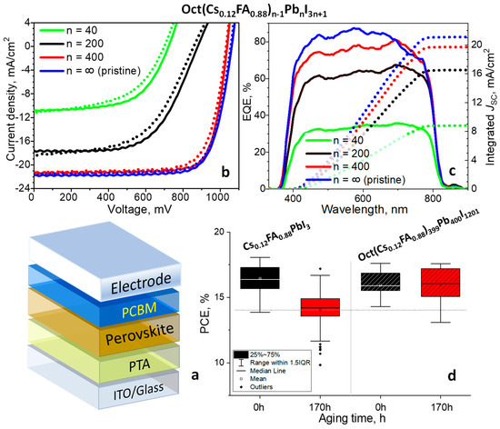 The effect of the OctI2 cation on the photovoltaic performance of the OctAn−1PbnI3n+1 (n = 40, 200, 400) absorber films was assessed for the Cs0.12FA0.88PbI3 perovskite system, which is highly promising due to its superior photostability [102]. The solar cells were fabricated with a planar p-i-n device architecture ITO/PTA/perovskite/PCBM/Ag (Figure 5a) in which poly[bis(4-phenyl)(4-methylphenyl)amine] (PTA) and phenyl-C61-butyric acid methyl ester (PC61BM) were used as hole-transport and electron-transport layer materials, respectively. The perovskite films were grown using the single-step spin-coating method. The device structure was completed by the evaporation of the top Ag electrodes (details are given in the Section 2).
