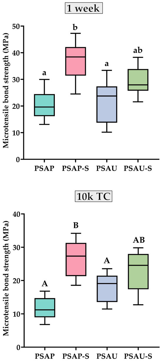Box-whisker plots illustrating the minimum, maximum, interquartile range, and median resin-ceramic microtensile bond strength (µTBS) expressed in megapascals (MPa) for all the experimental groups, measured either at 1 week or after artificial aging by thermocycling (10k TC). Statistically significant differences between the experimental groups recorded either at 1 week or thermocycling are indicated with different lower-case and upper-case superscript letters, respectively.
