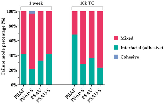 The percentage of the different failure modes of the tested microtensile bond strength (μTBS) microbeams of each experimental group reported either at 1 week or after thermocycling.