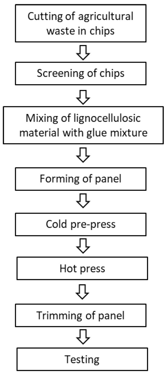 Hemp shives and wood chips were first oven-dried to a moisture content of 3–6%. After drying, the material was sent to the gluing machine to be mixed with the glue mixture consisting of the liquid resins and water. Ammonium chloride was also used as a hardener for the UF resin, while no hardener was used for the PF and PFS resins. The ratio of the glue mixture components in each case was resin/water = 12/1 for PF and PFS resins and resin/water/hardener = 3/1/0.2 for UF resin. Inside the gluing machine, the glue mixture was sprayed in the form of very small droplets. The adhesive level was 9–11% (dry adhesive to dry biomass). The adhesive-impregnated biomass pieces were mechanically laid out to form a board (the aim is to produce an even mat). The mat was then cold pressed, followed by hot pressing (15–35 kg/cm2 for particle boards with a density of 0.4–0.8 g /cm3) at temperatures of 150–200 °C. The pressing time is proportional to the thickness of the particleboard and is approximately 0.3–0.4 min per millimeter of finished product thickness. The panels were then trimmed and smoothed to obtain a smooth and flat surface and, finally, cut to the appropriate dimensions to obtain the necessary samples for the evaluation of their properties.