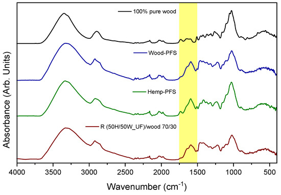 FTIR spectra of wood as a reference and the particleboard wood chips–PFS, hemp shives–PFS, and the recycled R (50H/50W_UF)/wood chips 70/30.