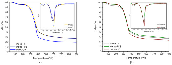 TGA thermogram of mass loss versus temperature curves of the wood chip (a) and hemp shive (b) particle boards prepared with PF, PFS, and UF.