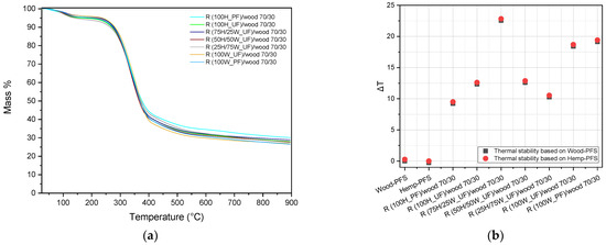 For a more comprehensive study of the recycled particleboards, a comparison of their thermal stability was conducted, with the initial particleboards consisting of 100% wood chips and 100% hemp shives, using the PFS resin, as studied in Figure 5. The thermal stability was assessed based on a 2% mass loss and is presented in Figure 6b. The black square points refer to the temperature difference between the wood–PFS (reference, T2% = 81.7 °C) and the other particle boards, while in the red circles, the hemp–PFS board is used as a reference temperature (T2% = 81.5 °C). It is first observed that both the hemp shive and wood chip particleboards exhibit similar values, as the mass loss in the two non-recycled boards is approximately the same; thus, the points are almost the same. Furthermore, the thermal stability of all the recycled particleboards is higher than that of the original ones, with the sample denoted as R (75H/25W_UF)/wood 70/30 being the most thermally stable. The increase in thermal stability can be attributed to the higher resin content in the recycled particleboards. The degradation of the cured resins initiates at approximately 200 °C, rendering the boards more thermally stable when compared to pure hemp shives or wood chips. During the recycling process, the resin may undergo further curing or cross-linking, which enhances its heat resistance and overall stability. Recycling also results in a reduction in moisture content within the particleboards. Lower moisture levels lead to improved thermal stability, as moisture can compromise the structural integrity of the boards and reduce their resistance to heat.