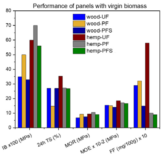 The performance of panels made from virgin biomass and reference resins is illustrated in Figure 7. The results show that hemp shive-based panels perform better in terms of mechanical properties (IB, MOR, MOE) regardless of the resin used. However, these panels perform slightly worse in terms of thickness swelling. This finding is consistent with the results of other studies [10] and is to be expected, as the cellulose that gives strength to composite materials such as particle board is found in higher concentrations in the hemp feedstock (72%) than in wood (42%) [47]. It is also known that hemp can rapidly absorb large amounts of water (up to 3 times its own weight) during material preparation [48,49].
