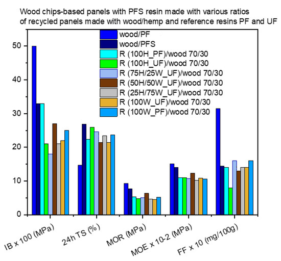 Figure 8 shows the properties of panels in which wood chips have been partially replaced by material obtained from the mechanical recycling of particleboards made with a mixture of wood chips and hemp shives in different proportions and the reference resins UF and PF. In this case, the end products were made with the PFS resin.