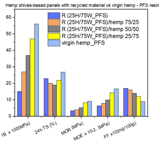In Figure 10, the above results with those of a panel made from 100% virgin hemp shives and PFS resin (Figure 7) are presented together for comparison. We can see that the same trend is followed and that the higher the content of virgin material, the higher the mechanical properties and the lower the formaldehyde content, while there is no significant effect on the thickness swelling (24 h TS).