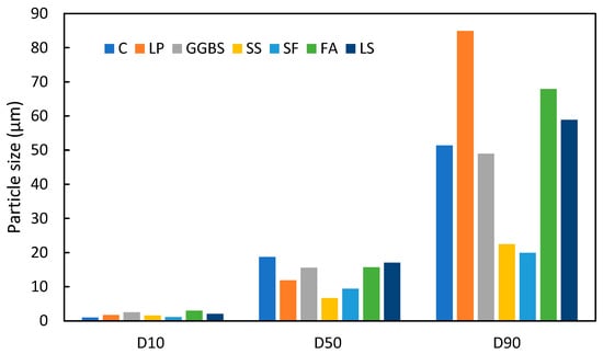 Particle sizes of different cementitious materials (C [62], LP [66], GGBS [46], SS [67], SF [68], FA [69]).