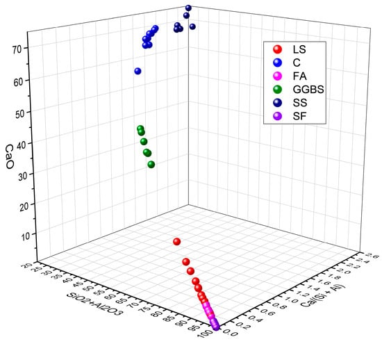 Moreover, the ratios of SiO2 + Al2O3 and CaO, as well as the Ca/(Si + Al) value, reflect its potential as an SCM and reveal differences in the pozzolanic reactivity and hydration activity. By analyzing the data presented in Table 3, the ranges of the SiO2 + Al2O3, CaO, and Ca/(Si + Al) of LS in comparison with C, FA, GGBS, SS, and SF were determined, as are shown in Figure 2 [76,77,78,79]. From this comprehensive analysis, it is evident that the composition of SiO2 + Al2O3, CaO, and Ca/(Si + Al) in the relevant literature exhibits considerable variations, thereby falling within the specified ranges of 17.7–97.6%, 2.2–62.9%, and 0.02–1.94%, respectively. These disparities manifest significant distinctions in the performance characteristics of cementitious materials. Specifically, when focusing on LS, the parameters SiO2 + Al2O3, CaO, and Ca/(Si + Al) fall within the narrower ranges of 70.3–80.7%, 2.5–18.5%, and 0.04–0.14%, respectively. It is apparent that, in comparison to C, where the Ca/(Si + Al) value typically resides around 1.4, a Ca/(Si + Al) value significantly below one in LS signifies the potential presence of pozzolanic reactivity in the LS, rather than predominantly indicating hydration reactivity [80]. In addition, upon comparing the chemical compositions of LS with those of commonly used cementitious materials, as are demonstrated in Figure 2, it becomes evident that LS shares compositional similarities with FA, which are characterized by high SiO2 and Al2O3 contents while exhibiting a low CaO content and Ca/(Si + Al) values. This resemblance categorizes LS as a low-calcium precursor with pozzolanic reactivity akin to that of FA [81].