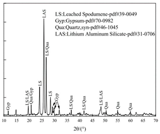 XRD analysis provides a quantitative assessment of the mineral composition of LS. According to references [34,39,45], the primary mineral phases in LS have been identified through XRD patterns, as are illustrated in Figure 3. These phases mainly include gypsum, quartz, and lithium aluminum silicate.