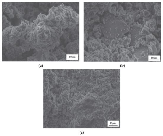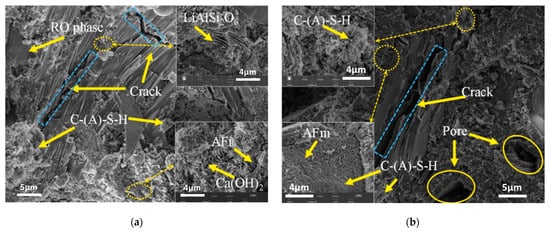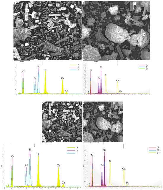 Javed et al. [23] employed SEM-EDS to explore the phase and morphological change between raw LS and calcined LS. LS comprises angular particles that are rich in aluminosilicate minerals, while the prismatic/elongated particles consist of gypsum, as is evidenced by the SEM/EDS analysis depicted in Figure 4a. The EDS points B and C on the micrograph exhibited peaks corresponding to aluminum, silicon, and oxygen EDS spectra, thereby confirming the presence of aluminosilicate particles. Conversely, EDS analysis of the prismatic particles shown in Figure 4b displayed peaks of calcium, sulfur, and oxygen, thus indicating the presence of gypsum. This observation supports the notion of sulfation occurring during lithium extraction in refineries [83]. These prismatic particles possess a size exceeding 50 μm. Through the calcination of LS, the aluminosilicate components undergo a transformation into agglomerated amorphous (glassy) phases due to sintering. Particle fragmentation is a consequence of the lithium refining process being applied to spodumene ore, which induces a certain level of reactivity within LS. Notably, the crystalline phase transformation within LS initiates from temperatures exceeding 800 °C [84]. Thus, a calcination temperature of 700 °C is considered to be suitable for the production of amorphous aluminosilicates [23]. Moreover, an approach combining thermal treatment with chemical activation was employed in the study of Li et al. [31] to enhance the reactivity of LS. The outcomes demonstrated that preheating effectively promoted the reactivity of the LS, thereby leading to a significant increase in the proportion of active amorphous components in the LS, which surged from 17.3 wt% to 50.7 wt% following heat activation at 700 °C. Karrech et al. [82] observed DβS, gypsum needles measuring about 20 μm in length, larger aluminosilicate particles, and other minerals, thereby suggesting an aluminosilicate grain with parallel cracks in it; such parallel cracks form during β-spodumene leaching due to Li-H exchanges.