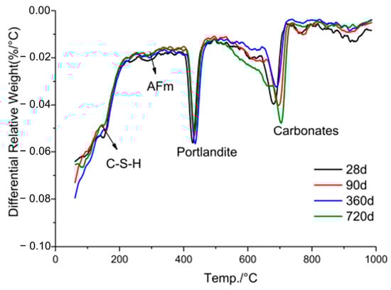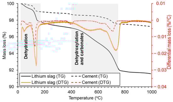 TG-DTG curves of LS and cement from room temperature to 990 °C [19]. Note: the shaded areas in the TG-DTG curves show the mass loss due to presence of moisture and gypsum, portlandite, and carbonates, respectively.