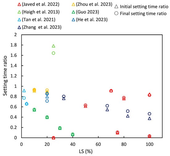 The setting time ratios of cementitious composites with varying levels of LS substitution [16,23,37,39,41,63,88].