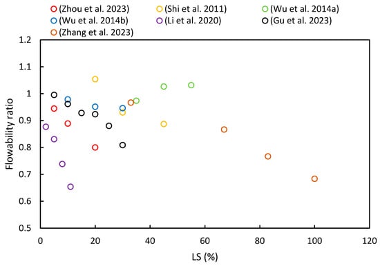 The flowability of fresh paste is primarily characterized through slump tests and flow table tests. Figure 7 summarizes the flowability ratios of cementitious composites with varying proportions of LS based on different literature sources. It is evident from most of the literature that flowability decreases with an increase in LS content. Specific details of these changes are as follows.