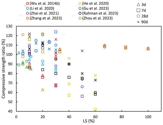 Figure 8 summarizes the findings from numerous studies investigating the compressive strength ratios under different age and LS substitution conditions. A recurring pattern in most of the literature indicates that as the LS content increases, the compressive strength ratio initially rises before gradually declining, thereby implying an optimal LS content. He et al. [33] observed that an LS content exceeding 20% had an adverse effect on the compressive strength of concrete, while Luo et al. [102] noted that the geopolymer compressive strength significantly improved with LS-based geopolymer contents below 70%. Furthermore, as the curing period increases, there is a growing trend in compressive strength ratios. This phenomenon can be attributed to the late-stage pozzolanic activity of LS, as has been discussed in Section 2.2.