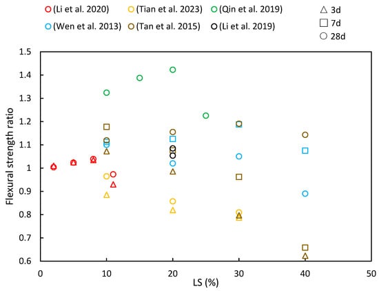 Figure 9 provides a summary of the flexural strength ratios reported in various studies at different levels of LS incorporation and testing ages. The general trend of the flexural strength ratios closely resembles that of compressive strength, as has been discussed in Section 4.1. In most cases, the strength ratio tends to increase initially and then decrease with increasing LS content, with early-age strength ratios being slightly lower than later-age ratios. This behavior can be attributed to several factors: Firstly, when a small quantity of LS (e.g., 10% or 20%) is mixed with cement paste, it is initially considered inert, thereby not actively participating in the early-age hydration reactions. This results in a higher retention of water, thereby promoting the formation of gel and subsequently increasing the strength. Additionally, LS contains gypsum, which enhances the reactivity of silica and alumina, thereby leading to the production of more C–S–H and hydrated calcium aluminate.