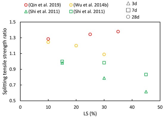 The splitting tensile strength ratios of cementitious composites at various ages and LS substitution ratios are depicted in Figure 10. It is evident from various literature sources that as the LS content increases, both increases and decreases in the splitting tensile strength ratios have been observed. However, with an increase in the curing period, the splitting tensile strength ratios were shown to consistently rise. At 28 days, the cementitious composites incorporating LS outperformed the control groups in the following studies, thereby highlighting the favorable long-term pozzolanic activity of LS. Qin et al. [51] employed LS derived from industrial waste to replace cement, thus aiming to enhance concrete’s mechanical properties. The results indicated that the splitting tensile strength initially increased and then decreased with a rising LS content, thereby reaching its peak improvement when the LS content substitution was at 25%. In addition, Wu et al. [92] observed that as the LS content ranged from 0% to 30%, the splitting strength values at 28 days exceeded those of the reference concrete. The maximum splitting strength was achieved at a 10% LS dosage, with a subsequent decline recorded as the LS content exceeded this threshold. Furthermore, Shi et al. [53] utilized LS as an SCM, thereby substituting 15–45% of the cement in high-performance concrete. The study revealed that the reduction in splitting tensile strength increased with a higher LS content at 7 and 14 days of testing.