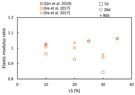 The elastic modulus ratios of cementitious composites at various ages and LS substitution ratios [50,51].