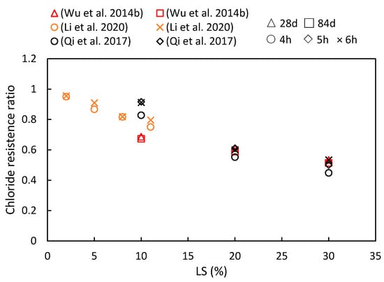 This study compiles the impacts of varying the LS content and the age of LS-based cementitious composites on chloride ion migration, as are summarized in Figure 12. The consistently observed chloride resistance ratio below one indicates that the LS enhanced the chloride ion migration resistance of cementitious systems. Furthermore, with an increase in the composite age, the resistance of the cementitious system to chloride ions has been shown to strengthen. Specific reasons for these findings are elucidated upon synthesizing the results from diverse studies. To begin with, Qi et al. [56] demonstrated a positive correlation between the LS content and the chloride penetration resistance. They reported a significant 43% reduction in the electric flux in concrete containing 30% LS compared to concrete without LS after 6 h of electrification. This improvement was attributed to the rapid secondary hydration of the LS and cement hydration products. This secondary hydration process transforms loosely bound Ca(OH)2 crystals, which tend to grow at the concrete interface, into a more compact gel-like layer, thereby reducing porosity and increasing chloride resistance. Additionally, Wu et al. [92] observed that the chloride ion diffusion coefficient gradually decreased with an increase in the total dosage of admixtures and extended curing time. The minimum chloride ion diffusion coefficient was achieved when the LS content was 30%, and the FA content was 20%. This reduction was due to the Al2O3 and SiO2 from the LS and FA engaging in secondary hydration reactions with the Ca(OH)2 in cement hydration. These reactions generated more hydrated aluminate and Friedel’s salt, thereby optimizing the structure of the interfacial zone and blocking penetration channels. Furthermore, Li et al. [49] measured the electric flux in samples at 28 days and found that different LS amounts enhanced the chloride penetration resistance. An 8% LS content led to an 18.9% reduction in the electric flux compared to the control group.