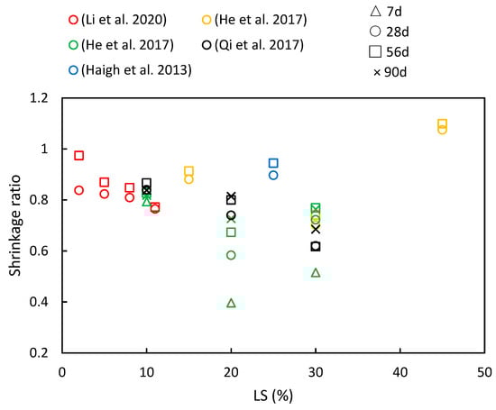 A compilation of shrinkage ratios in cementitious composites with varying LS contents and different ages [36,41,49,50,56].