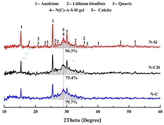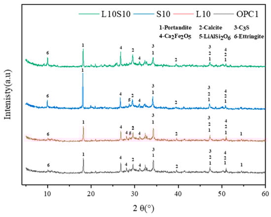 The chemical composition analysis of LS serves to provide fundamental data for assessing its potential as a cementitious material. Numerous studies have investigated the chemical composition of LS through XRF testing, as are depicted in Table 3. The analysis reveals that the primary chemical components of LS are SiO2, Al2O3, and CaO. SiO2 and Al2O3 are predominantly present in the form of H2O·Al2O3·4SiO2 (aluminum silicate), while CaO primarily exists as CaSO4 (anhydrous gypsum) [74]. Furthermore, LS exhibits a notable sulfur trioxide (SO3) content, thereby typically existing in the form of CaSO4·2H2O, which, upon reaction with calcium hydroxide, can lead to expansion. This limitation prevents the substantial inclusion of LS as a mineral admixture [75]. Interestingly, in numerous pieces of literature, the chemical composition does not mention the content of Li2O. This is primarily because the Li2O content in LS is generally less than 1%, and Li2O is not considered to be a significant influencing factor on the performance of LS [39].