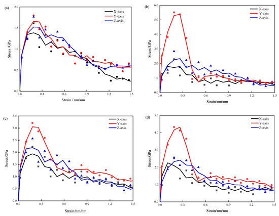 When conducting uniaxial tensile tests on the CSH models, the polymer–CSH crystal interaction was examined under different calcium-to-silicon ratios. The NPT ensemble method was utilized to release any excess stress, ensuring that the model was not subjected to external pressure in the x-, y-, and z-axis directions. The 3-APTES modified CSH model was subjected to a tensile rate of 0.08 ps-1 in the x-, y-, and z-axis directions. When the model was stretched along a specific axis, the forces acting in the other two orthogonal directions were set to zero, indicating that the applied force was the principal stress in the stretching direction.