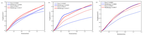 During toughness tests on the CSH models, the material’s toughness variations were primarily characterized by the stress and strain of the material. The strain energy per unit volume was utilized to evaluate the toughness changes in the 3-APTES modified CSH models. The strain energy per unit volume represents the potential energy of stress and strain within the material [29,30,31,32]. The formula for calculating the strain energy per unit volume is as follows: