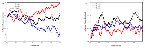Figure 4 illustrates the adsorption performance between water molecules and the silicon chain in the 3-APTES modified CSH model under different calcium–silicon ratios. As seen in Figure 4a, the tensile adsorption performance along the y-axis increases with the increasing strain, while the adsorption performance along the x-axis and z-axis decreases relatively with the increasing strain. At a strain of 0.6 nm/nm, the adsorption energy along the y-axis reaches as high as −0.56 kcal/mol. This indicates that when stretched along the distribution direction of the silicon chain, there is stronger bonding between the silicon chains and a lower amount of water molecule distribution. As the strain increases, the adsorption performance enhances. When stretched perpendicular to the silicon chain direction, there are more water molecules distributed, leading to a continuous decrease in the adsorption capacity, which suggests that the stretching direction has a significant impact on the adsorption energy between the interface and water molecules. As seen in Figure 4b, when conducting stretching tests in different directions in the CSH simulation, the adsorption capacity between the interface and water molecules strengthens with the increasing strain. With the increase of the calcium–silicon ratio, the 3-APTES organic compound exhibits higher deformation ability, and water molecules are distributed relatively uniformly in all directions, thereby enhancing the adsorption capacity between the crystal interface and water molecules.