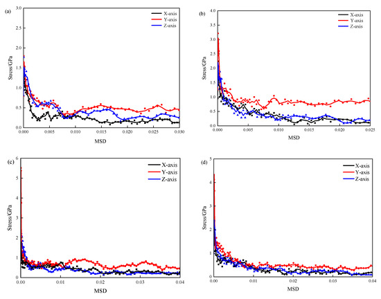 The MSD represents the trend of water molecules within the crystal structure as the stress changes. From Figure 6, it can be observed that as the MSD increases, the stress exhibits a sudden drop during the elastic stage, followed by a slow decreasing trend.