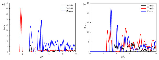 In Figure 6a, it can be observed that when the modified CSH is stretched along the x-, y-, and z-axes, the maximum peak positions of Ca-O are within the ranges of 3.3–3.5 Å, 1.8–2 Å, and 4.3–4.5 Å, respectively. This indicates that when the modified CSH is stretched along the x-, y-, and z-axes, the number of Ca-O chains at 2 Å, 3.5 Å, and 4.5 Å increases, leading to a significant increase in density. In Figure 6b, it can be seen that when the modified CSH is stretched along the x-, y-, and z-axes, the maximum peak positions of Ca-O are within the ranges of 6.2–6.4 Å, 5.2–5.4 Å, and 3.2–3.4 Å, respectively. This suggests that when the modified CSH is stretched along the x-, y-, and z-axes, the most significant density enhancement occurs at 6.4 Å, 5.4 Å, and 3.4 Å, respectively. With an increase in the Ca/Si ratio, the RDF values continuously decrease, and the r values between atoms increase. This indicates that as the Ca/Si ratio increases, the number of Ca-O bonds increases. There is bonding between the calcium and oxygen atoms, leading to a noticeable aggregation of Ca-O after the 3-APTES modification.