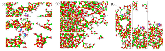 In Figure 1, green represents Ca, red represents O, and yellow represents Si. The ratio between calcium and silicon atoms in the CSH structure is called the calcium–silicon ratio, which is Ca/Si. By removing silicate tetrahedra and calcium ions, the Ca/Si ratio was adjusted to 0.83 and 1.7, satisfying the Qn distribution observed in solid-state nuclear magnetic resonance (NMR) studies and consistent with most experimental investigations on CSH. When Ca/Si is 0.83, the contents of Q0, Q1, Q2, and Q3 are 4.1%, 10.9%, 77.4%, and 7.7%, respectively; and when Ca/Si is 1.7, the contents of Q1, Q2, and Q3 are 16.9%, 70.1%, and 13%, respectively. The structures were then expanded and water molecules were added using the grand canonical Monte Carlo (GCMC) method at 298 K and 1 g/cm3 until the CSH crystal achieved 100% water saturation [20,21,22]. Finally, 3-APTES was inserted into the CSH crystal structures with different Ca/Si ratios. The pure CSH model and the 3-APTES modified CSH model were subjected to energy optimization using the CVFF force field and then molecular dynamics simulations were performed under the NVT ensemble [23].