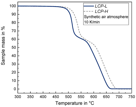 The TGA results are depicted in Figure 1. Qualitatively speaking, both LCPs exhibit a similar two-step thermal decomposition behavior. The decomposition of LCP-L starts at around 466 °C whereas the decomposition of LCP-H starts at a slightly higher temperature of approximately 480 °C. A significant sample mass reduction of 5% is observed at 497 °C for the LCP-L and at 512 °C for the LCP-H. The TGA results are in good accordance with the findings in [37], where a two-step decomposition of the LCP-L was observed in an air atmosphere. On the contrary, a nitrogen atmosphere resulted in a one-step decomposition. Using a coupled TGA-FTIR analysis, ref. [37] revealed that the primary degradation products are carbon dioxide (CO2) and carbon monoxide (CO) in both the air and nitrogen atmospheres. The oxygen (O2) present in the air atmosphere participates in the decomposition reaction and lowers the required activation energy Ea for thermal decomposition [37].