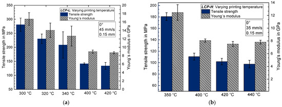 Tensile strength and Young’s modulus as a function of printing temperature (a) for LCP-L and (b) for LCP-H.