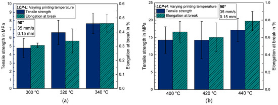 In contrast to the observation for 0° samples, an increasing printing temperature results in an increasing tensile strength for 90° samples (see Figure 3). The maximum tensile strength amounts to 17.1 ± 3.3 MPa for LCP-H at 440 °C and to 7.7 ± 1.2 MPa for LCP-L at 340 °C. Like tensile strength, the elongation at break also increases by increasing the printing temperature for 90° samples. Nevertheless, the elongation at break is very low and amounts to 0.31–0.46% and 0.60–0.79% for LCP-L and LCP-H, respectively.