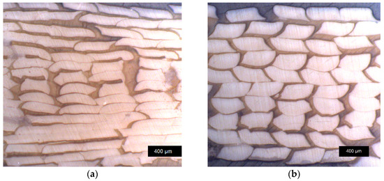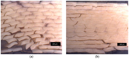 Light microscope image of 90° LCP-L samples: (a) before annealing (P–320–35–0.15); and (b) after annealing at 300 °C for 72 h (P–320–35–0.15–72 h). Samples were analyzed after tensile testing.