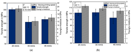 Tensile strength and Young’s modulus as a function of printing speed (a) for LCP-L; and (b) for LCP-H.