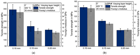 Tensile strength and Young’s modulus as a function of layer height (a) for LCP-L and (b) for LCP-H.
