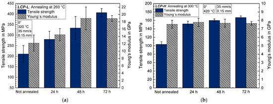 Tensile strength and Young’s modulus as a function of annealing time (a) for LCP-L and (b) for LCP-H.