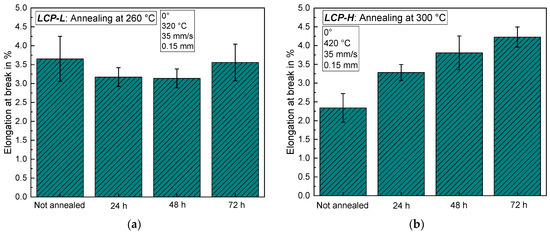 The influence on tensile strength and Young’s modulus of a subsequent annealing step at elevated temperatures under vacuum is depicted in Figure 9a for LCP-L and in Figure 9b for LCP-H. For LCP-L, longer annealing times lead to a steady increase in tensile strength, which rises from 210 ± 40 MPa without annealing to 406 ± 19 MPa after 72 h of annealing at 260 °C. The Young’s modulus also increases from 12.2 ± 2.2 GPa to 18.9 ± 0.8 GPa after 72 h. In the case of LCP-H, the tensile strength rapidly increases within the first 24 h from 103 ± 6 MPa to 152 ± 6 MPa. After that, the tensile strength only increases slowly up to 167 ± 4 MPa after 72 h at 300 °C. The Young’s modulus is unaffected by the annealing and remains at around 7.6 ± 0.5 GPa independent of the annealing time, which is contrary to the observation for LCP-L. Similarly, the observation differs for both LCPs regarding the elongation at break. In the case of LCP-L, the elongation at break remains roughly constant between 3.1 and 3.6%, whereas the LCP-H exhibits a steady increase from 2.3% to 4.2% (see Figure 10).