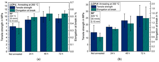 Tensile strength and elongation at break for 90° samples as a function of annealing time (a) for LCP-L and (b) for LCP-H.
