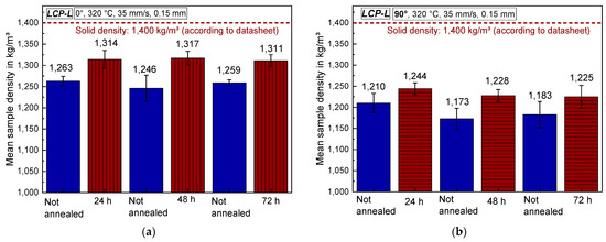 The mean sample density before and after annealing was determined by simply weighing the samples, measuring the sample dimensions with a caliper, calculating the volume, and dividing the determined mass and volume. It can be seen in Figure 12 that the density for both 0° and 90° samples increases by approximately 3–6% due to annealing. The volume decreases during annealing, whereas the mass remains constant. In the case of 0° samples, the sample length increased but the width and height decreased. In the case of 90° samples, the length and height decreased, whereas the width remained nearly constant. The solid density of LCP-L amounts to 1400 kg/m3 according to the datasheet and the unannealed 0° samples exhibit a density of approximately 1250 kg/m3. Hence, the total porosity of unannealed samples amounts to around 11% and to 6% after annealing.