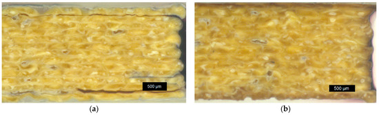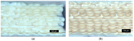 Light microscope images of fractured LCP-L samples with layer heights of 0.10 mm and 0.20 mm can be found in Figure 8a and Figure 8b, respectively. It should be emphasized that the visible strand separation is only caused by the fracture and that the non-tested samples exhibit good cohesion within the whole sample. According to the quantitative analysis of 20 randomly chosen strands, the mean strand width amounts to 414 ± 44 µm for the 0.1 mm sample and to 419 ± 25 µm for the 0.2 mm sample. The mean strand height amounts to 101 ± 12 µm for the 0.1 mm sample and to 193 ± 13 µm for the 0.2 mm sample. The previously defined layer height and the real layer height of the printed sample are thus in good agreement for both cases.