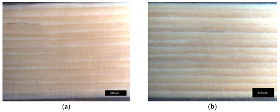 It can be concluded that the annealing had no significant influence on the macroscopic printing structure. Effects like an increasing contact area formation between individual strands (or a neck growth analogous to the so-called two-sphere sintering model from ceramics) were not observed for both LCP. Light microscope images of 90° LCP-L samples are shown in Figure 15. The strand deposition lies in the horizontal direction in this case. Like the 0° samples, these samples also show no macroscopically visible change with respect to the contact area between the individual layers during annealing, despite the increasing tensile strength and layer adhesion (see Figure 11).