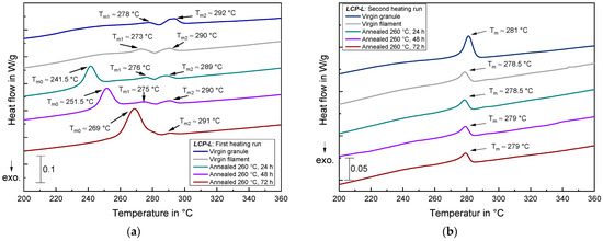 In order to explain the increasing tensile strength, Young’s modulus and sample density during annealing, DSC measurements were performed for virgin and annealed samples. Figure 16a depicts the first heating run for the LCP-L and Figure 16b shows the second heating run. Both virgin granule and virgin filament show two very small endothermic peaks at approximately 273–278 °C (Tm1) and at 290–292 °C. On the contrary, the annealed samples exhibit three endothermic peaks with an additional peak (Tm0) emerging at lower temperatures. The peak temperature of this endothermic event significantly increases during annealing from 241.5 °C at 24 h to 269 °C at 72 h. In the latter case, the peak of Tm0 merges with the small peak of Tm1. The totalized enthalpy for all observed endothermic events amounts to 6.8 J/g for the virgin filament, to around 9.6 J/g for the 24 h and 48 h samples and to 10.3 J/g for the 72 h sample. Thus, annealing leads to a certain increase in transition enthalpy and to the emergence of an additional endothermic event whose peak temperature shifts to higher temperatures for longer annealing times.