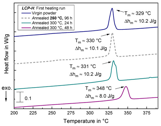 For the second heating run, the LCP-H exhibits the same qualitative behavior as the LCP-L, meaning that all heating curves are quasi-identical, independent of the annealing time. In the second heating run, the endothermic peak is also very small for all samples with a melting enthalpy of approximately 4.3 J/g and a peak temperature of 316 °C. Hence, the second heating run is not depicted for the LCP-H since there is no additional gain in knowledge compared to the behavior of LCP-L.