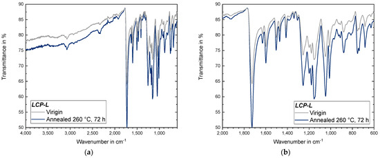 IR measurement of an LCP-L sample that was subject to annealing: (a) for the entire recorded range of 4000–400 cm−1; and (b) with a zoom to the 2000–400 cm−1 region.