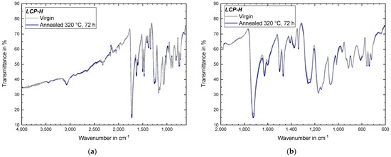 IR measurement of an LCP-H sample that was subject to annealing: (a) for the entire recorded range of 4000–400 cm−1; and (b) with a zoom on the 2000–400 cm−1 region.